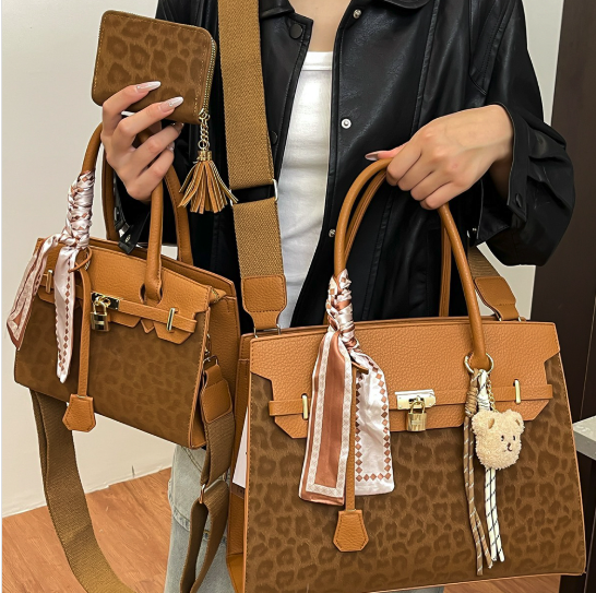 LEO25502-T3 BR Leopard Texture Satchel W Matching Bag And Wallet Set (3 N 1)